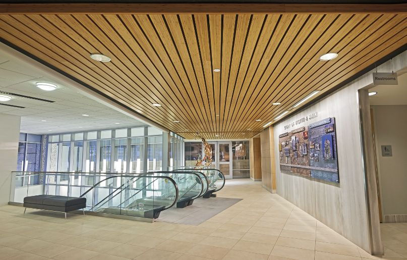 Sound absorbent black acoustical felt is factory installed to each slat - filling the joint between each slat. Slats are installed end-to-end using our black Linear Felt Clips - forming a continuous wood appearance along the space.